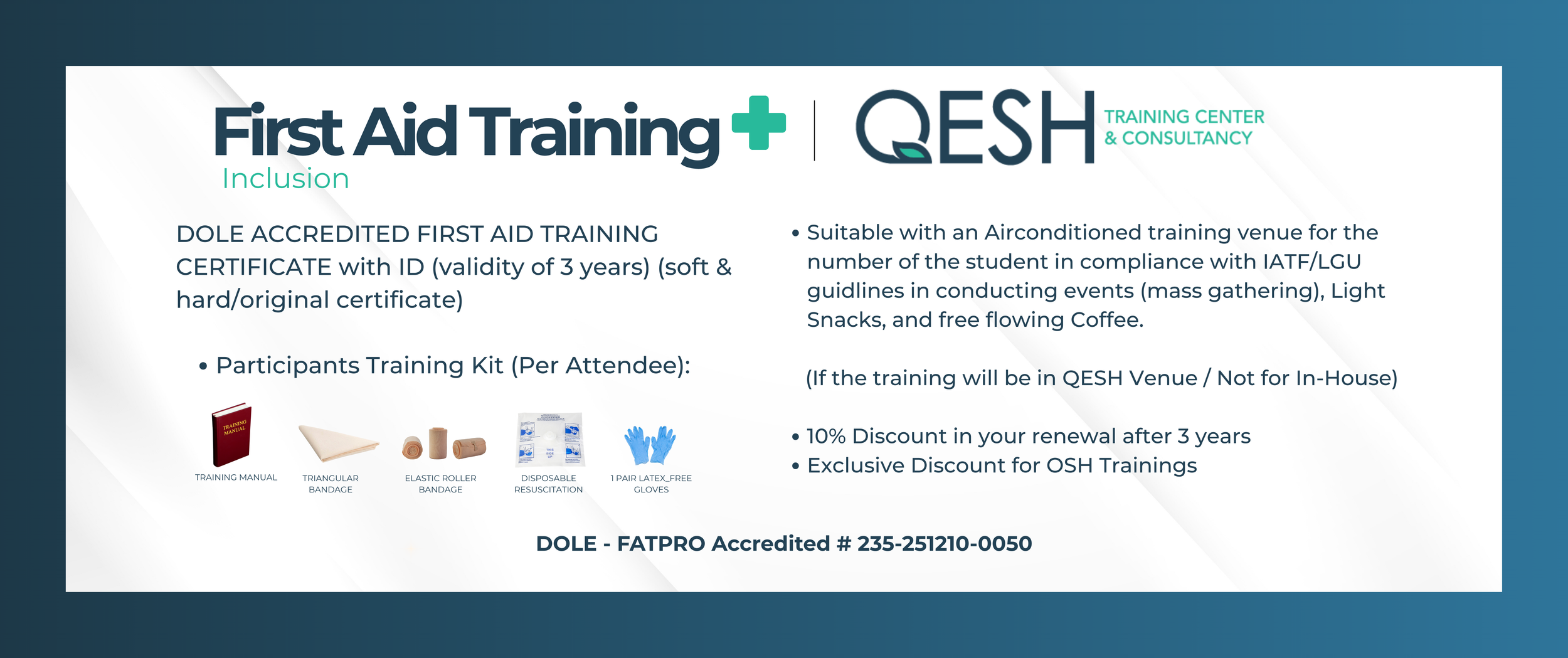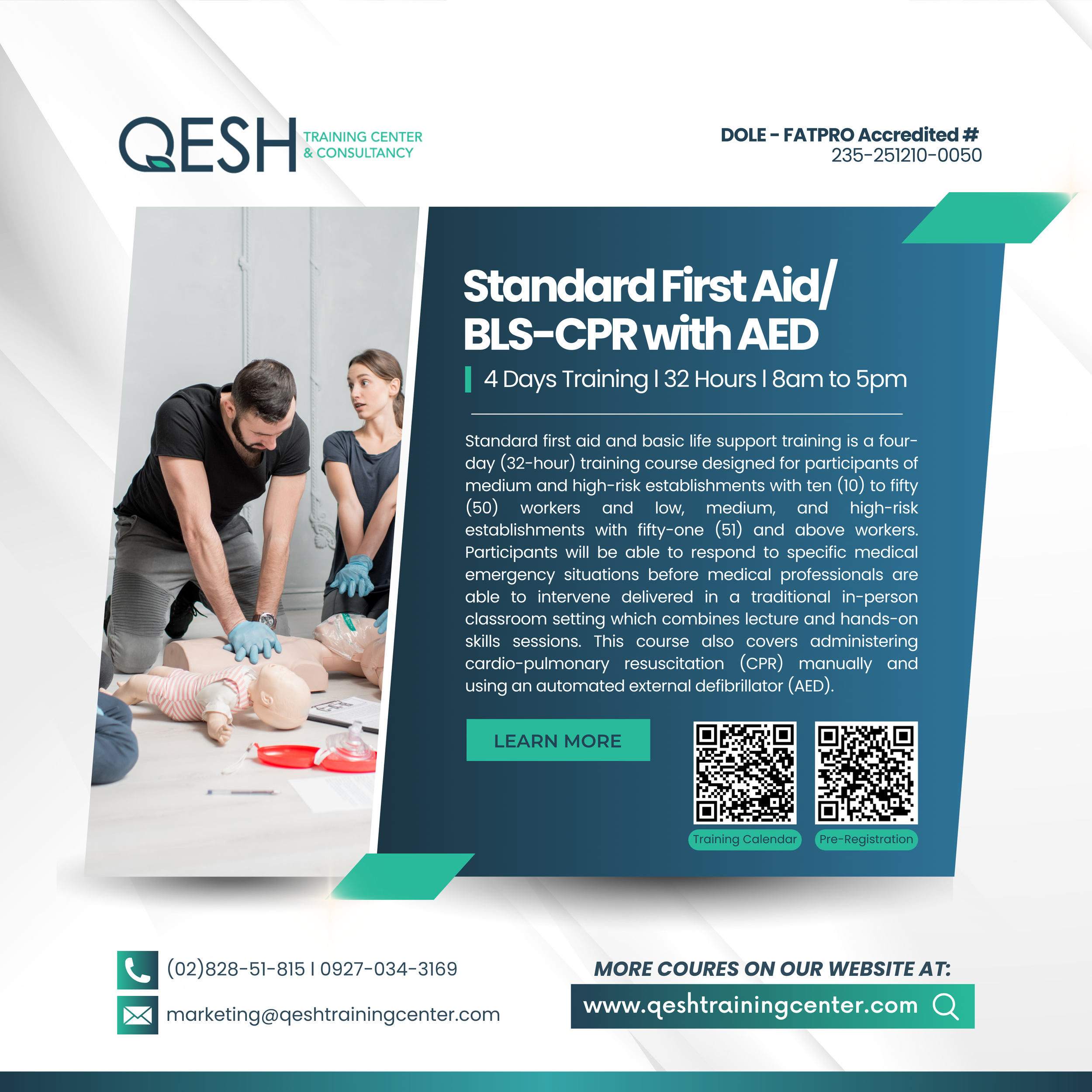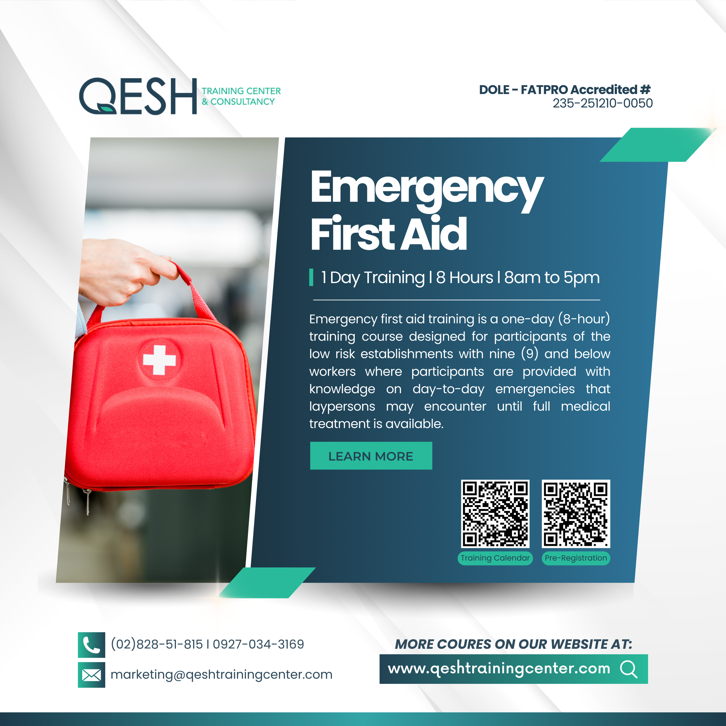 You can be a hero by learning and providing first aid when the time comes. Here at QESH we make sure that you will be at your Safest working environment by providing trainings and imparting knowledge. We offer you DOLE-accredited training courses. ENROLL NOW to enhance your safety knowledge and become a QUALIFIED SAFETY OFFICER and CERTIFIED FIRST AIDER here in the Philippines.