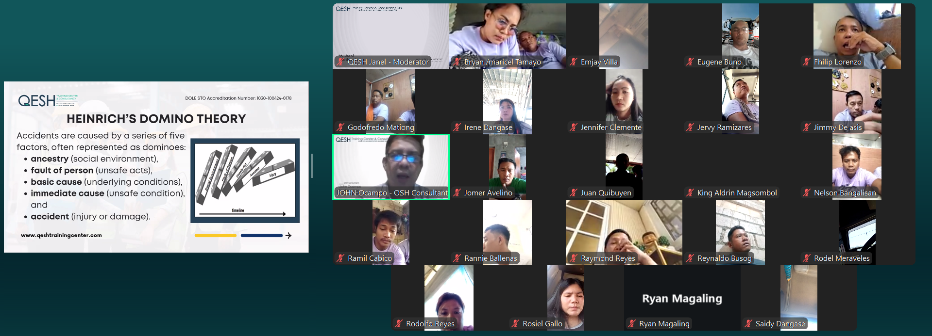 The training was facilitated by John Ocampo, who guided participants through key safety concepts and practical workplace applications aligned with Occupational Safety and Health Standards. The online format allowed participants to conveniently access structured safety training while ensuring compliance with regulatory requirements.