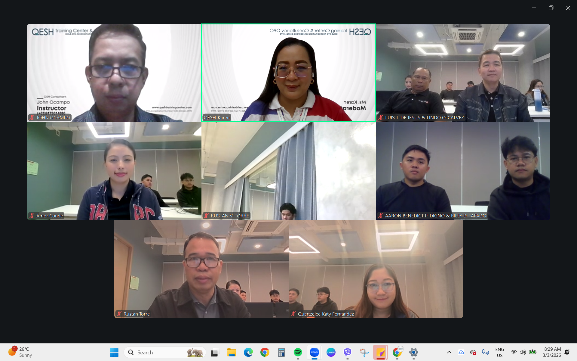 QESH Training Center & Consultancy OPC conducted a Mandatory (8) – Eight Hours Occupational Safety & Health Orientation Webinar for Quartzelec Ltd. Philippines on March 3. The online orientation provided participants with essential knowledge on workplace safety fundamentals, including hazard identification, accident prevention practices, and the responsibilities of employers and workers under the Occupational Safety and Health Standards. The session emphasized the importance of building a strong safety culture and maintaining compliance with national safety regulations.